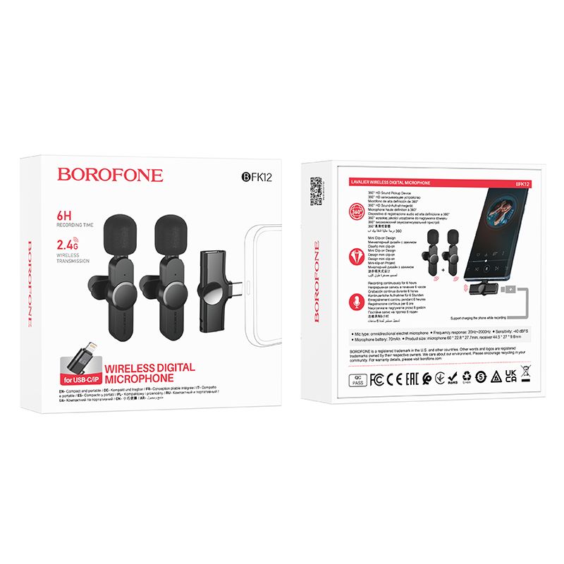 Elevate your content with the Borofone BFK12 Trophy Wireless Microphone. Featuring a professional omnidirectional electret mic, it captures 360° crystal-clear digital audio for vlogs and interviews. This ultra-lightweight 20g system includes a Type-C receiver and a Type-C to Lightning OTG adapter, ensuring seamless compatibility across almost all smartphones and tablets. Powered by a reliable 70mAh battery, its compact 60mm frame is designed for discreet, plug-and-play recording. Whether you're on an iPhone or Android, the BFK12 delivers stable, high-fidelity sound in a portable, high-performance package.
