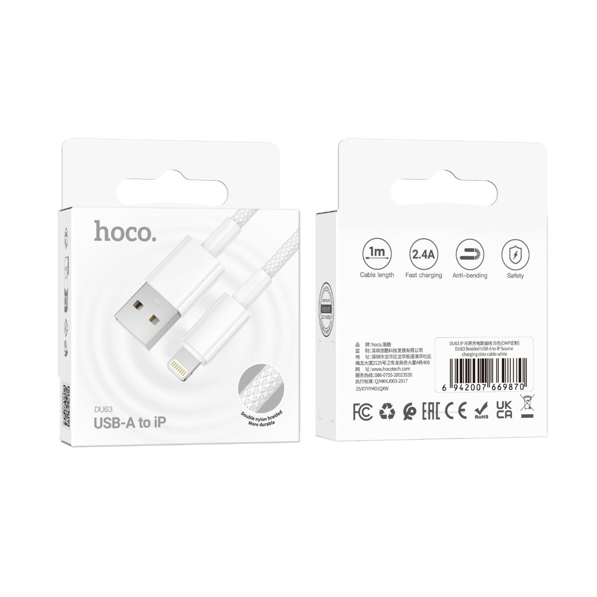 Hoco DU63 USB-A to Lightning Braided Charging Cable - White