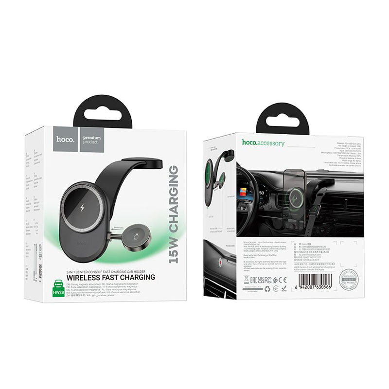 Revolutionize your commute with the Hoco HW28 Excelso 2-in-1 Wireless Car Charger. Expertly crafted from premium zinc alloy and ABS, this center console mount features a sleek, electroplated finish that complements any interior. Designed for MagSafe compatibility, it provides up to 15W fast charging for smartphones and a dedicated 2.5W spot for Apple Watch (Series 1-9/Ultra). Its secure chuck fits devices from 4.5 to 7.0 inches, ensuring a stable, hands-free experience. Drive with confidence knowing your tech is powered up and perfectly positioned for navigation.